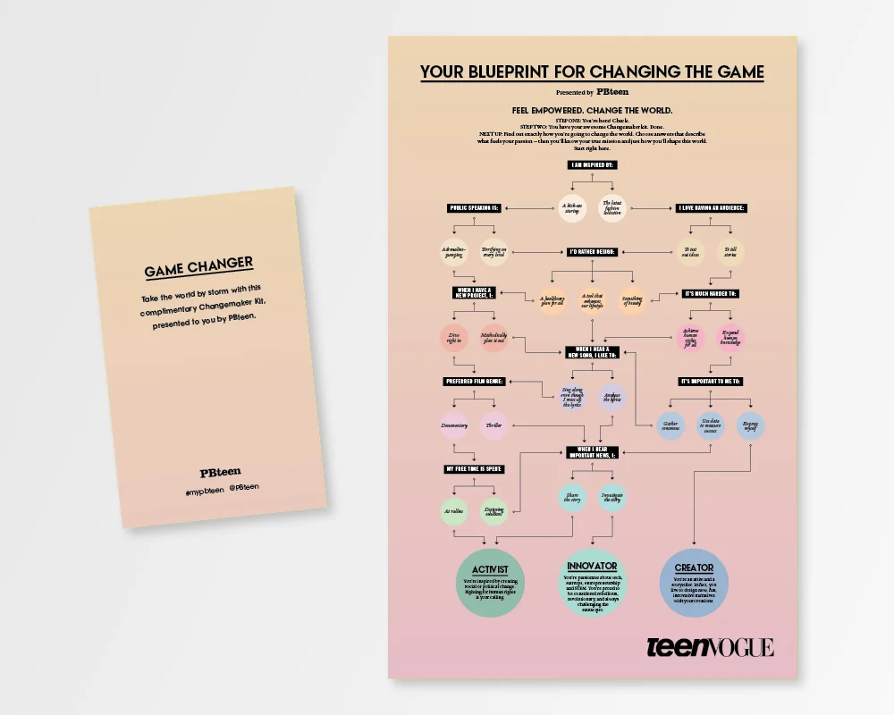 PBteen CHANGEMAKER BLUEPRINT POSTERS: Flow chart posters, sponsored by PBteen, given to 500+ event attendees of the Teen Vogue Summit, encouraging them to find their path to "changing the game."