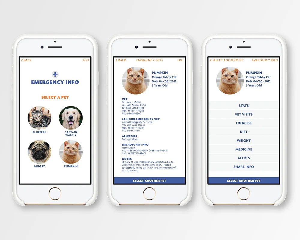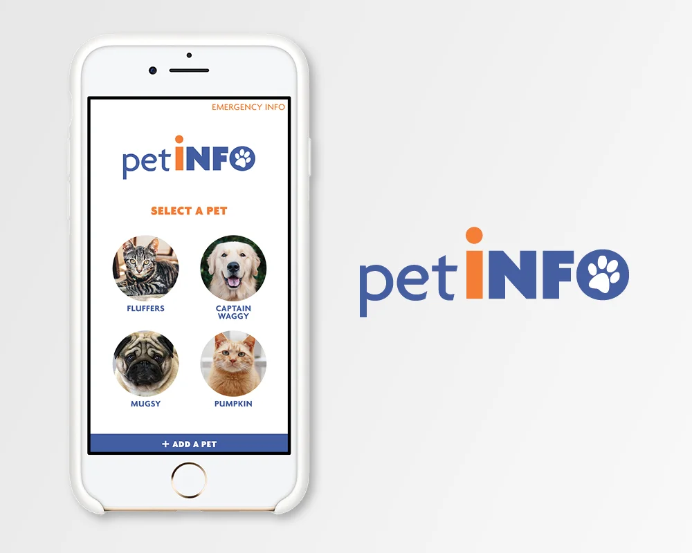 PET INFO:  Concept, logo, and design for app featuring an easy way to store and access your pets' health information.